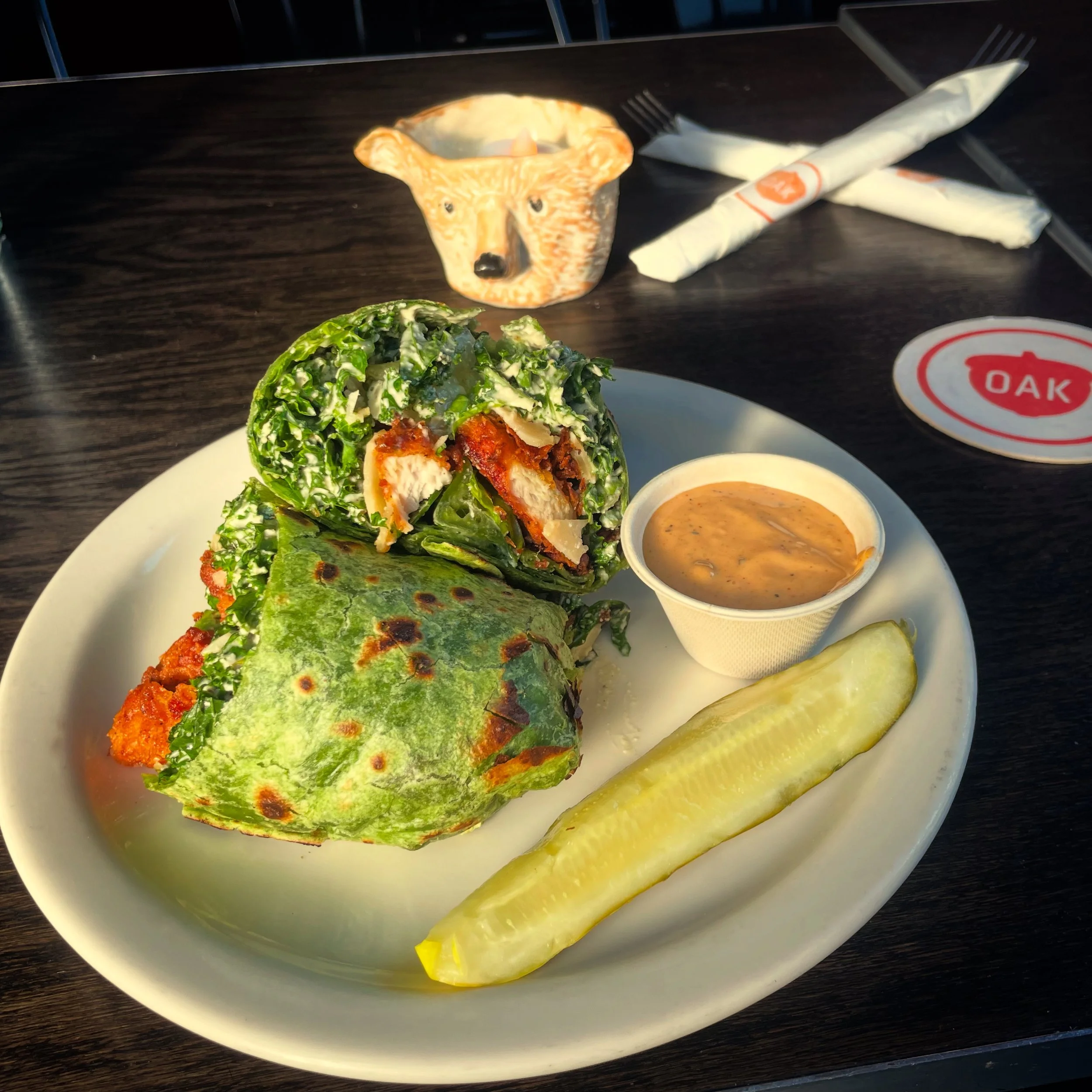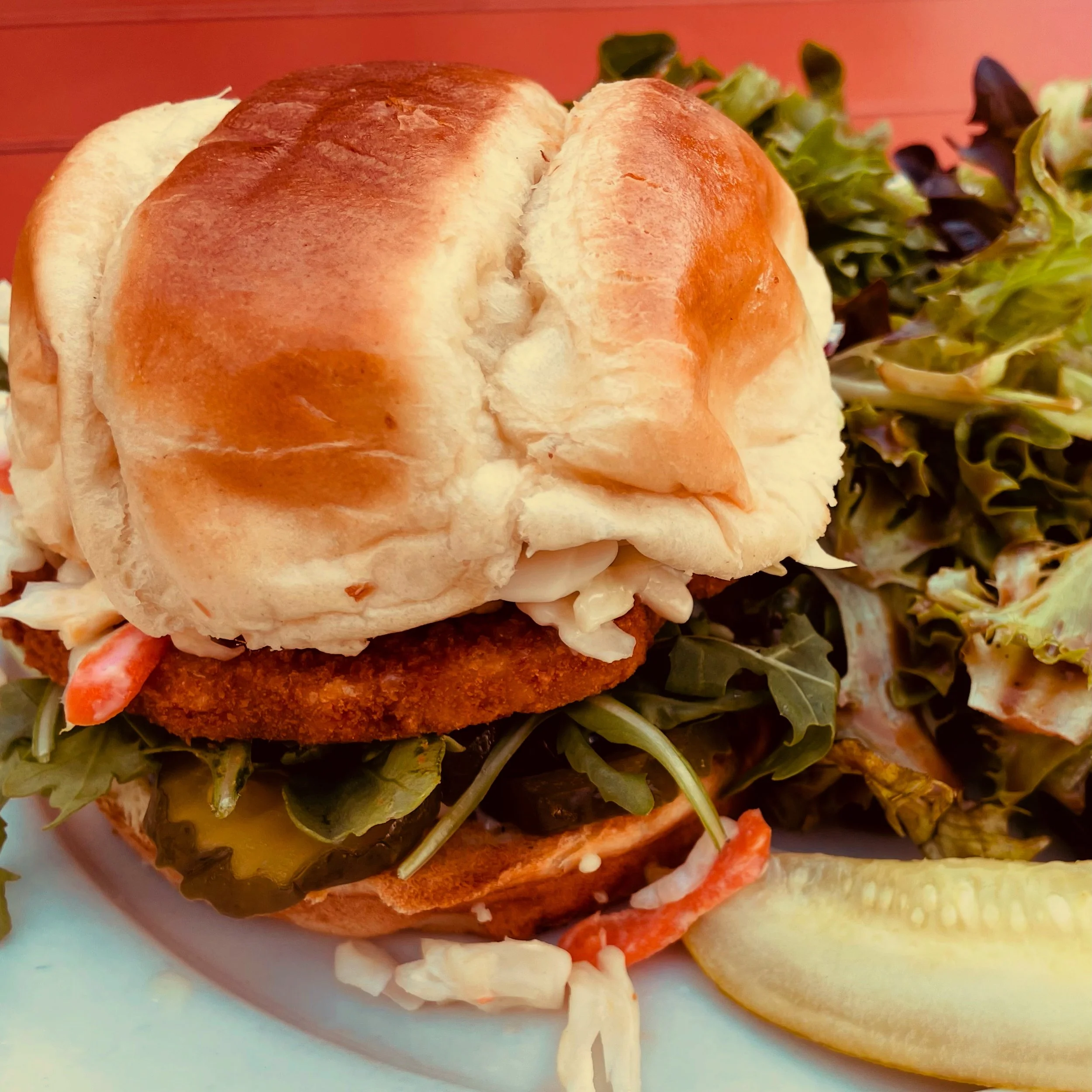Vegan Field Roast burger patty made of barley, fresh carrots & celery, creamy vegan cheese slice, with arugula, tomato, house-made onion ring, and Oak’s BBQ sauce