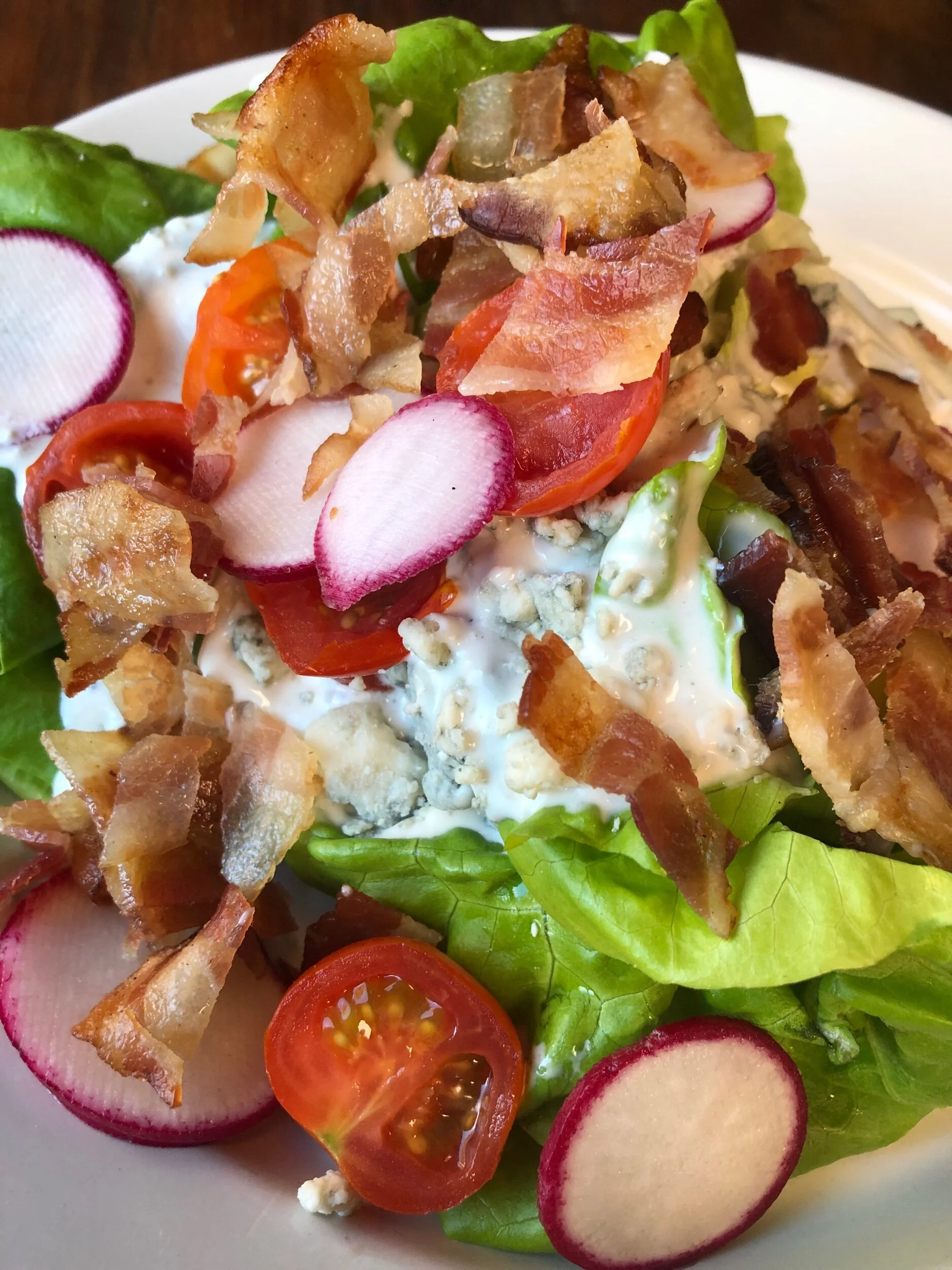 The Butter Wedge - now on Oak’s Specials Menu! All the things you love about a classic wedge salad, but we ditched the iceberg and replaced it with luscious fresh butter lettuce! Homemade extra blue-cheesy dressing, cherry tomatoes, smoked bacon, radish, and Gorgonzola crumbles. 🧀🥬🥓🍅