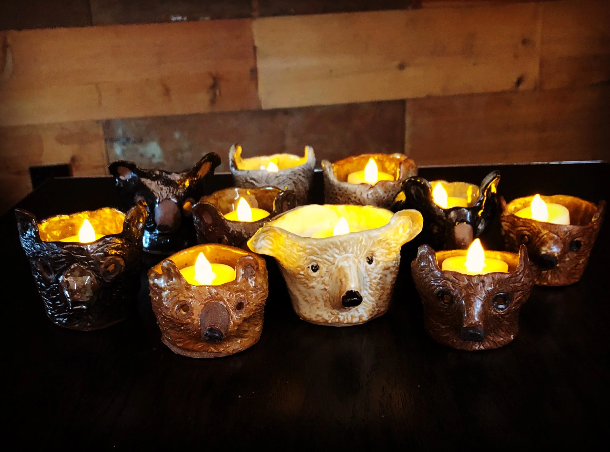 It’s the Candle-Bear brigade! If you have visited The Den (Oak’s back room) in the past couple of weeks, you may have noticed a member of the Candle-Bear brigade at your table. These beautiful bears are another work of amazing art from one of Oak’s owners, Kelly Staton. She hand created each unique little bear, making The Den even more of an amazing cozy space. In case you did not know, she is also responsible for all the amazing mural work on the walls of the dining room and bar. So much love and thought goes into the decor at Oak! Thank you for this, Kelly!