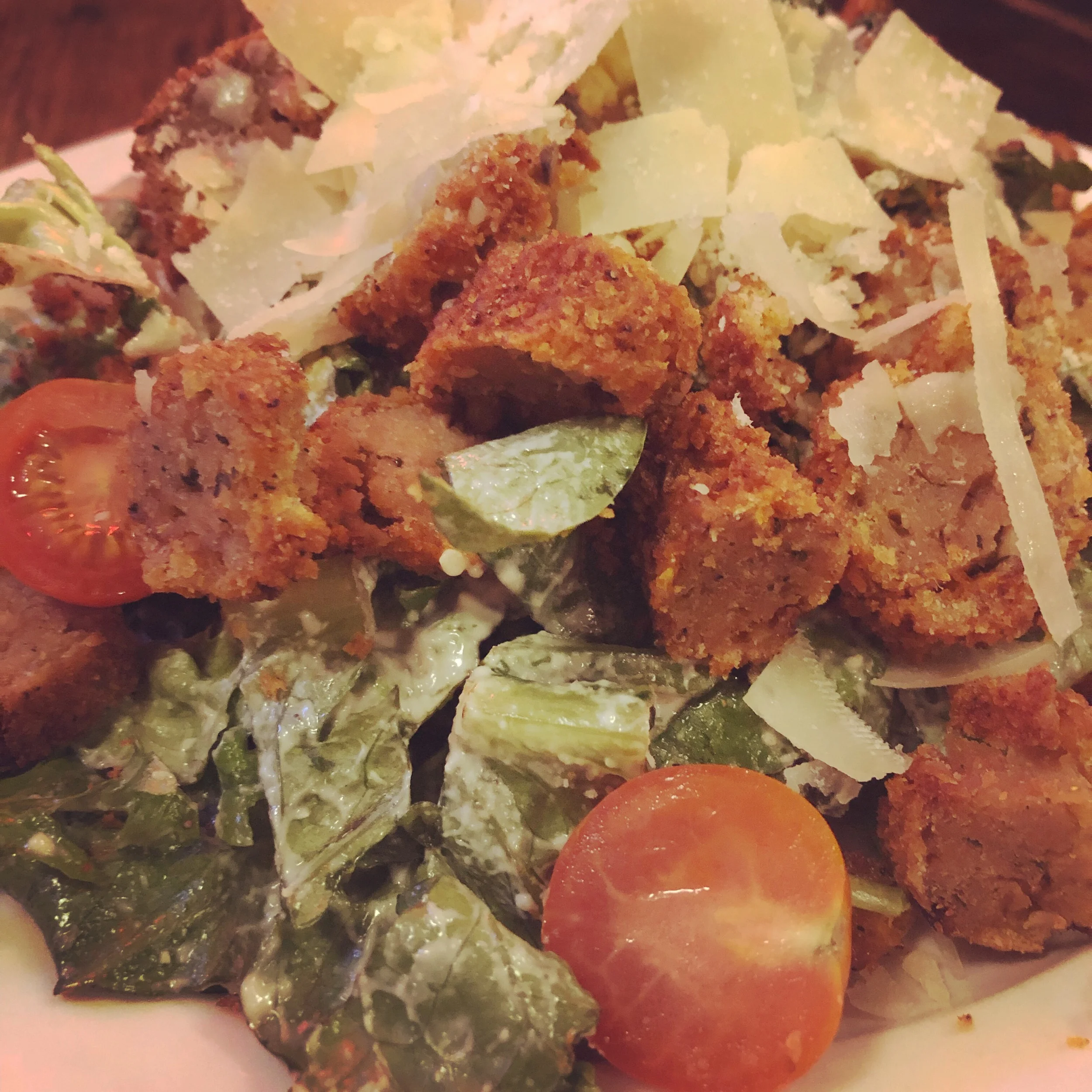 Oak’s heartiest and popular dinner salad, The Kale Chicken Caesar, has many faces. Enjoy it with our delicious fried chicken, have it completely vegan with our house made faux-chicken tenders, or ask for it vegetarian style with shaved Parmesan atop the faux-chicken as is pictured here! Equally decadent in all forms!