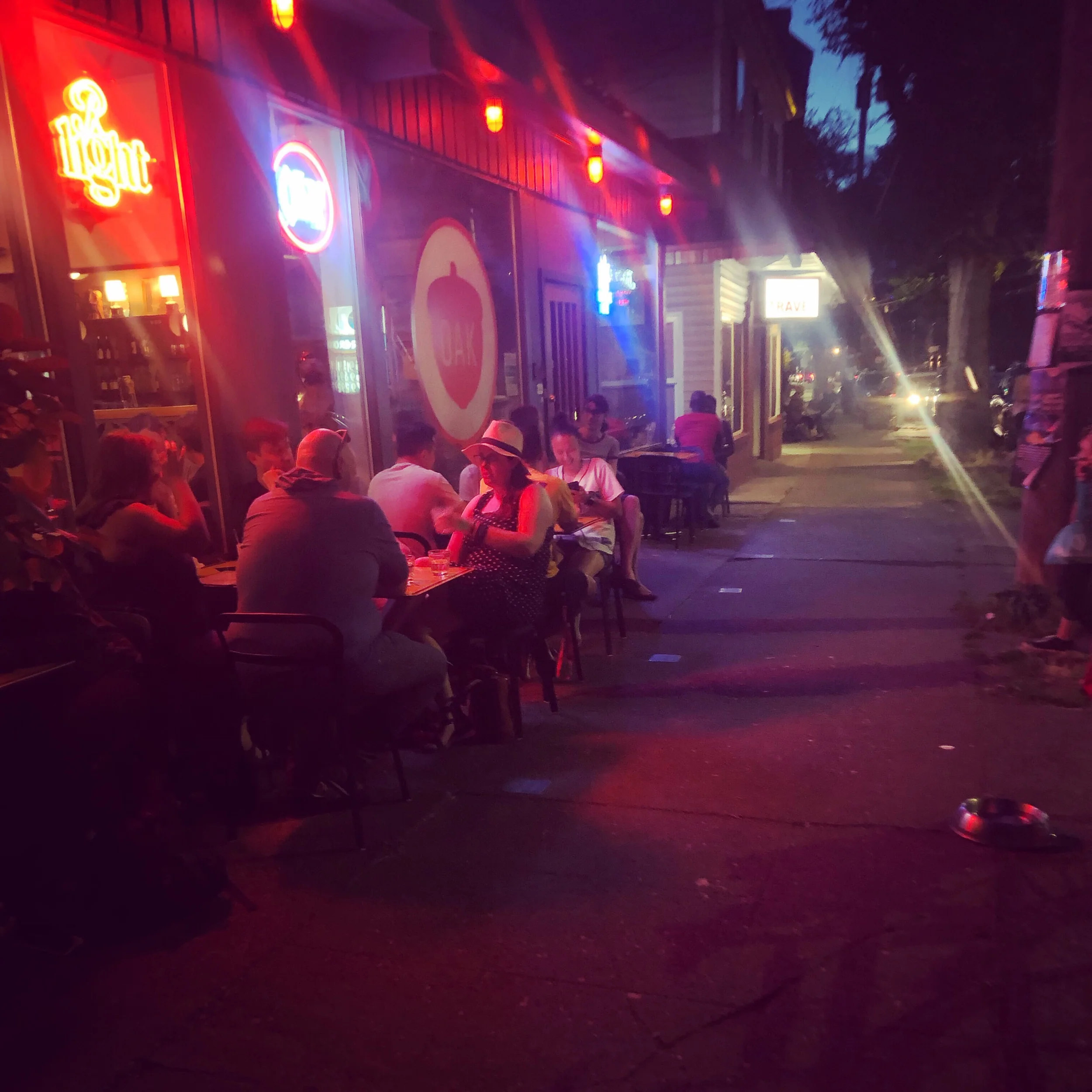 Just some folks basking in the glow of our awesome neon lights, absorbing that warm summer night air, and enjoying some delicious foods and tasty beverages! If you haven’t had a chance to chill in our sidewalk cafe yet, come on by! #sidewalkcafe #outdoorseating #summernights