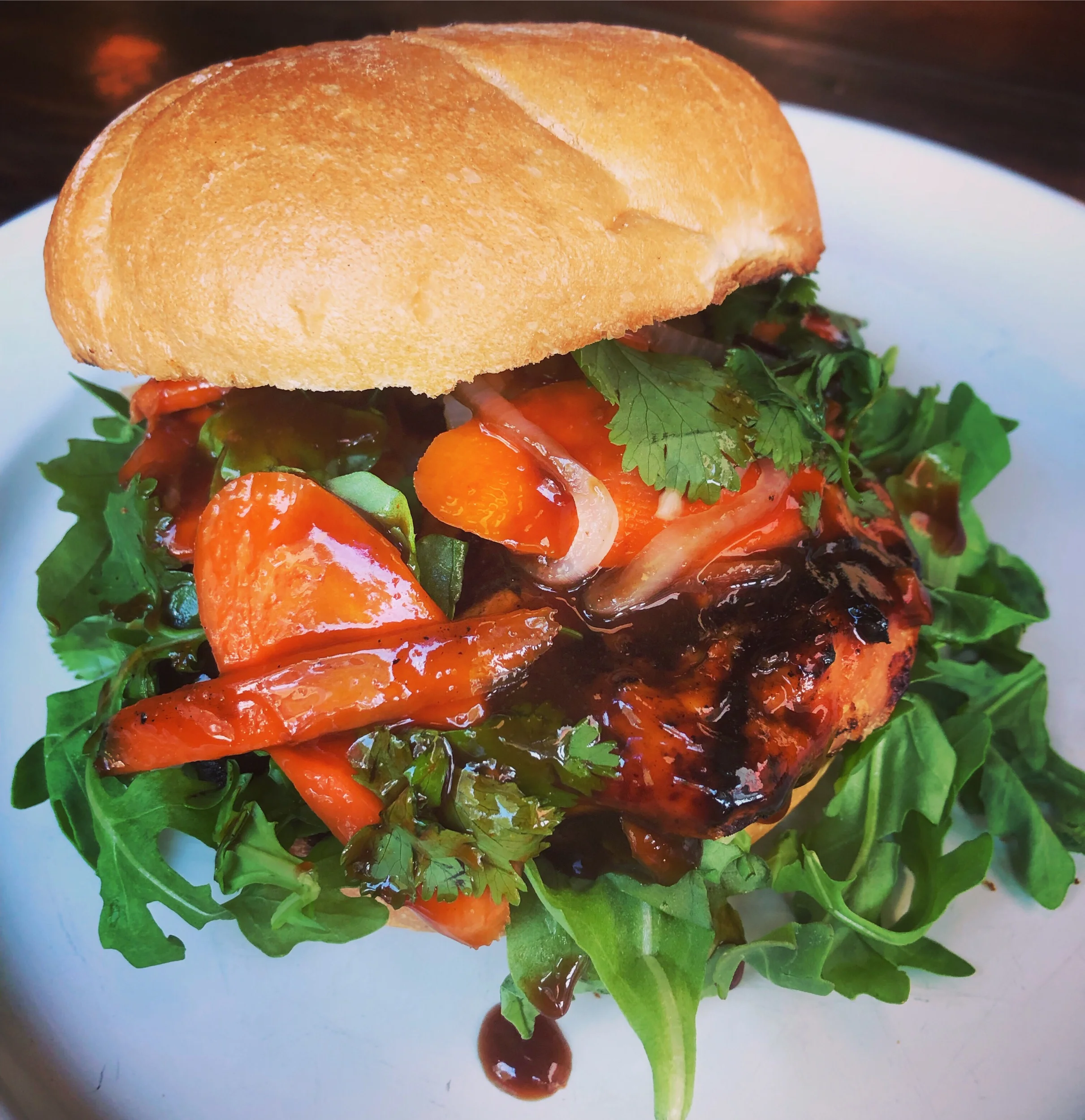 This tasty morsel is on Oak’s Specials Menu right now - The Organic Chicken Bahn Mi - Sandwich consisting of grilled organic Draper Valley chicken breast with hoisin barbecue sauce, arugula, and a medley of pickled vegetables, with a sprinkle of fresh cilantro! Vegan version available with a bbq grilled tofu cutlet. YUM!