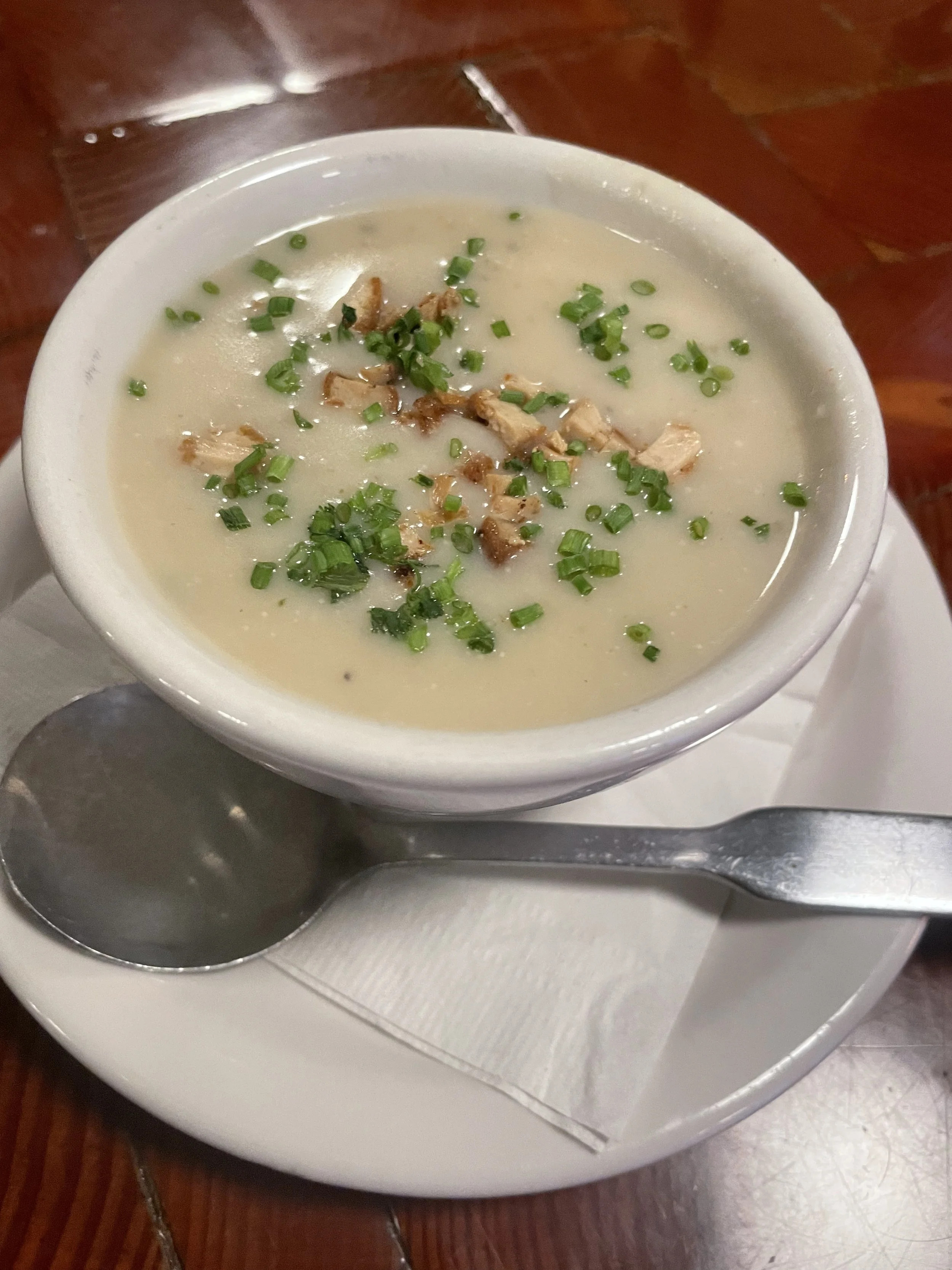It’s wet and cold out there— this weather calls for hot soup! Oak’s soup is Coconut Potato - a creamy, rich, coconut-milk based soup seasoned with thyme and garlic, topped with bacon bits and chives. The vegan version has bits of our house-made vegan tofu bacon. 🤤