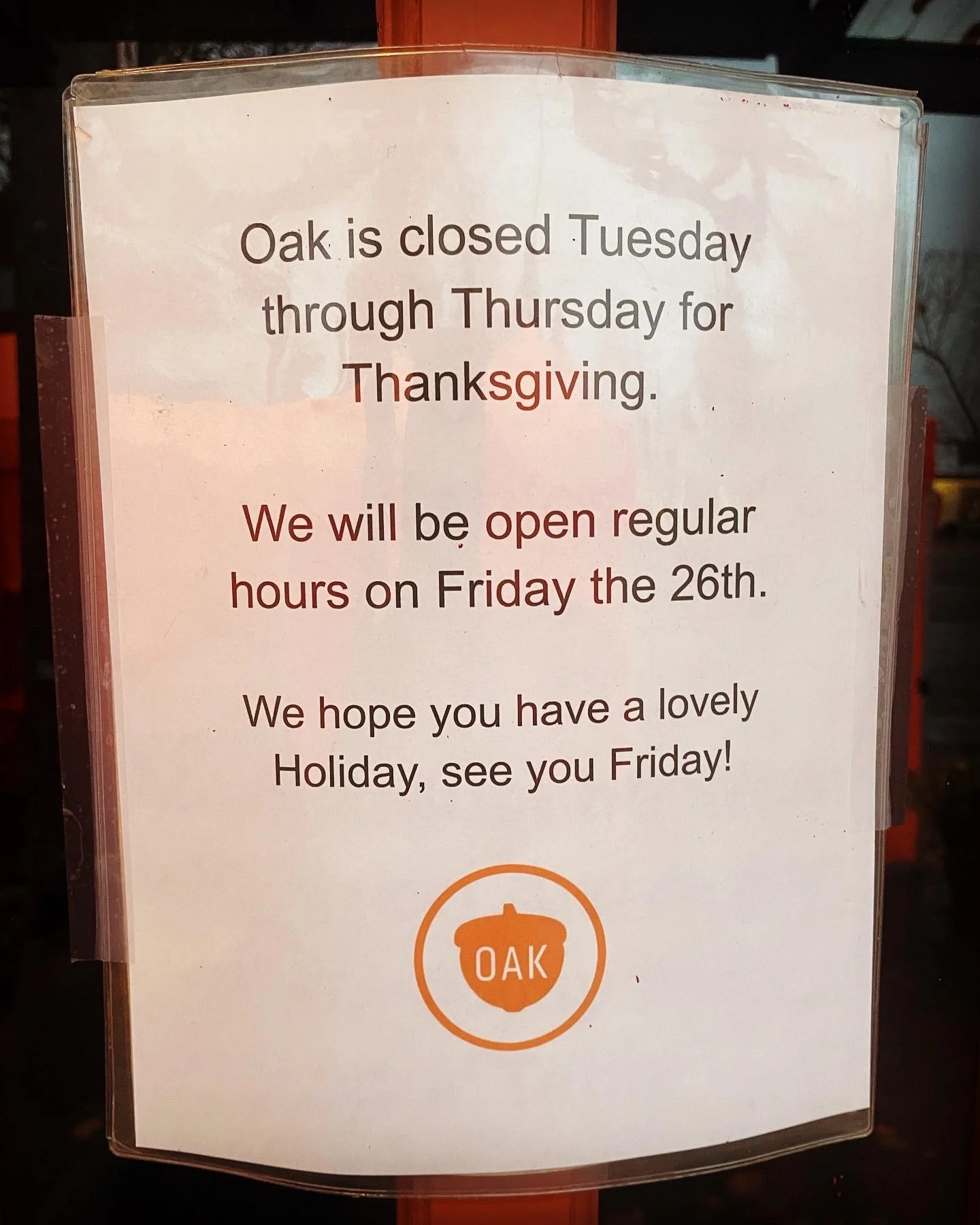 Just a friendly reminder that we are closed for the holiday until Friday! You can always make a reservation for Friday or the weekend anytime at oak-Seattle.com 😊