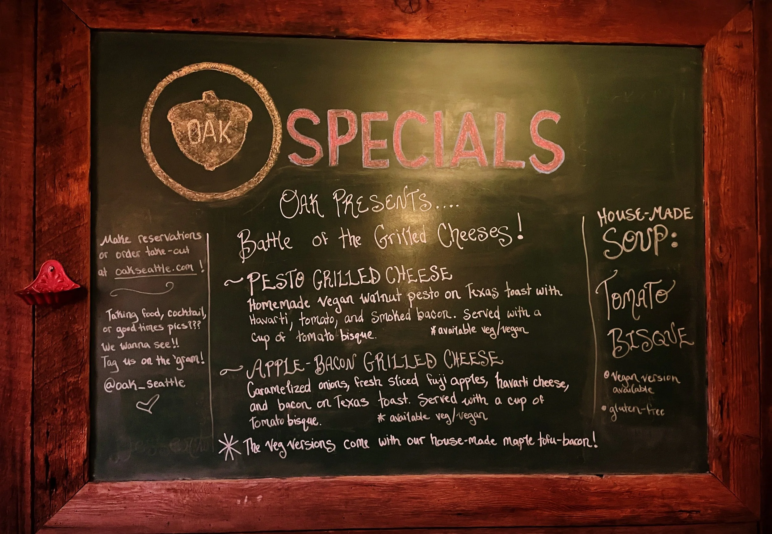 New Specials!! It’s the Battle of Grilled Cheeses at Oak!! Option A) pesto, bacon, cheese OR option B) caramelized onions, bacon, cheese, and fresh apple slices?!?! Try ‘em both, let us know which one wins! Vegan versions available of both with our house-made vegan tofu-bacon and vegan cheese. 🧀 ♥️🧀♥️🧀